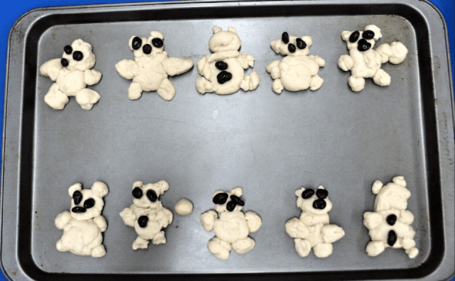 We also made buttermilk biscuit bears. As you can imagine, this was a HUGE hit! And it was super easy. All I did was buy two packages of Pillsbury buttermilk biscuit dough and give everyone a chunk of dough (one pre-cut biscuit per child). I had to show some of the kids how to shape the bear, but most of them were in there like dirty shirts.