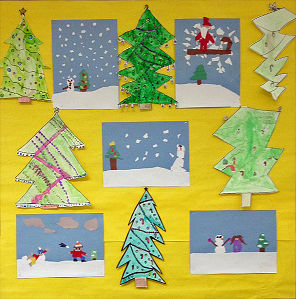 These snowy pictures are very simple but I like how some of the kids used torn paper to represent the snow.
