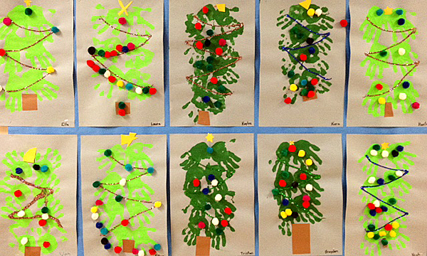 I thought these hand-print Christmas trees were so unique! After making the branches with their hands dipped in paint the kids glued on pom poms for the ornaments and connected them with glitter strings.