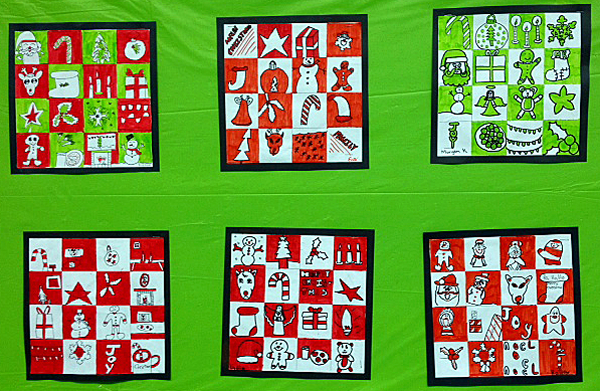 Little Christmas quilts! I think the use of just red, white or green is very effective. All their little drawings were outlined with a black sharpie.