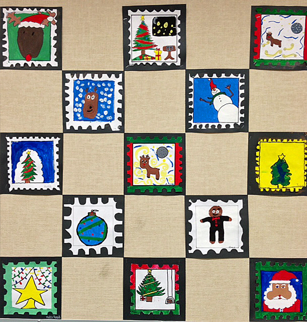 These are Christmas stamps created by a Grade 4 class. They were all done in tempera paint. I love the bright colours and how they added the variegated edges to the stamps.