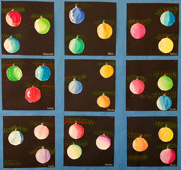 I think these Christmas ornaments are stunning! They look especially wonderful on black paper. The kids traced circle templates and then coloured them in using chalk pastels. I love how they practiced shading and adding bits of highlights!