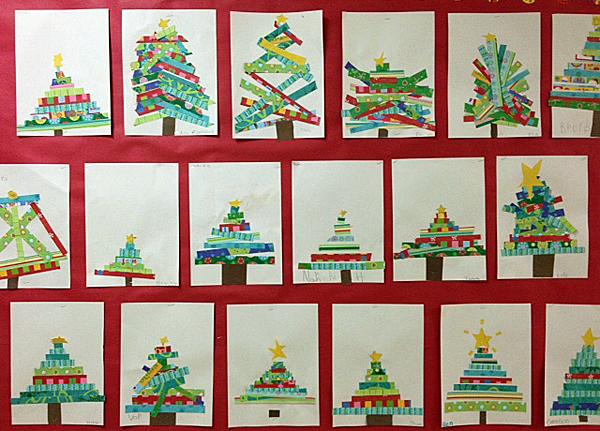 These colourful Christmas trees were made by cutting various lengths of paper strips from Christmas wrapping paper. You could also use scrapbook paper. I love how bright and whimsical they are!