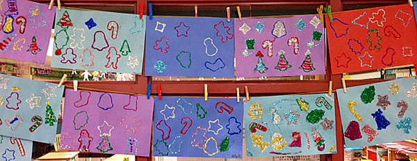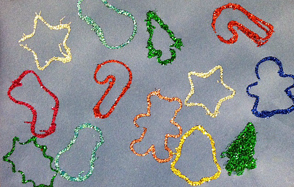These were done by another primary class. The kids used cookie cutters to trace their various shapes. Then they outlined them in glue and added glitter.