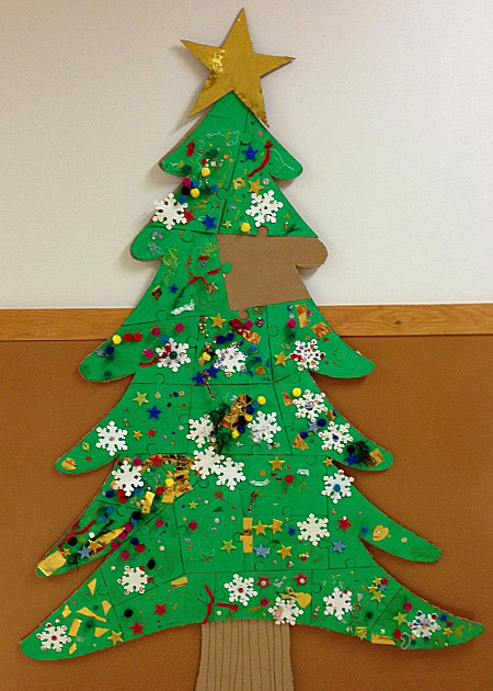This is a puzzle Christmas tree. Each child was given a piece of the puzzle and asked to decorate it with the various supplies that were provided. They used lots of foamy stickers. Such a clever idea.
