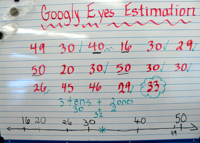 Then I draw a number line and we place the smallest and greatest estimates on either end. We then spend a bit of time figuring out where some of the other numbers would be placed on the line. I have the kids justify their responses.