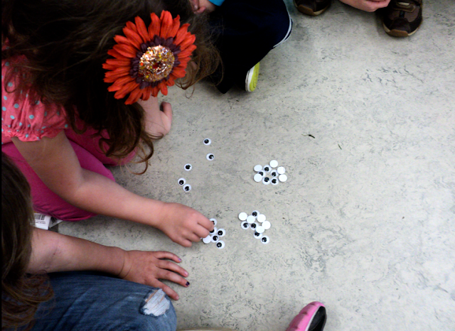 Next step is to count the objects.  In this picture, you can see the child who brought in some googly eyes. She’s putting them into groups of 10. We count up to 10 for each group and then I say, “So four tens is how much?” and the kids respond.