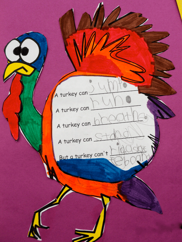 The kids had a lot of fun with this one. We brainstormed all the things a turkey can do (I wrote them out on the smart board) and some funny things that turkeys can’t do.