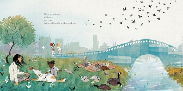 This book is a meditation on the present moment. The author takes you through the day, reminding you to notice the little moments, such as phones ringing, a baby growing, and an idea blooming. Through the lyrical text and Goodale’s simple, but beautiful illustrations, Denos brings our attention to what is happening all around us, such as rain collecting in clouds, the animals we don’t always see, and our beautiful planet spinning in space.