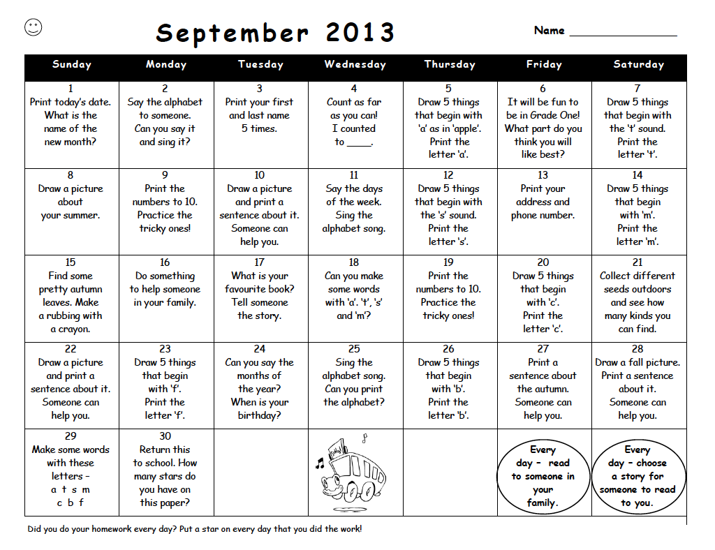 For this reason, I think Jean’s Homework Calendars are perfect. Each day there’s a little task to do. None of the tasks take very long and there’s lots of variety. I tell the parents it’s completely optional, but if they choose to have their children participate then they’re to send the calendar sheet back to school with an initial beside each day, showing that their child completed the daily homework.