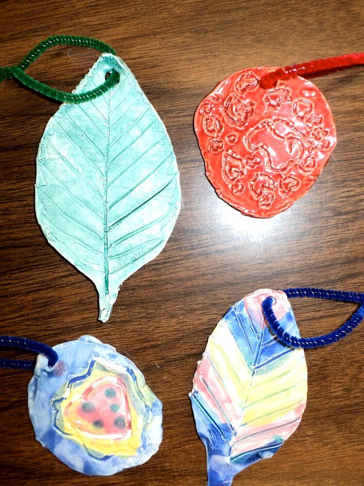 But the leaf ornaments were made with real leaves. You just press the back of the leaf onto the clay, get an adult to cut carefully around the edges and voila!