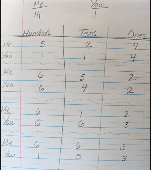 The kids sat on the mat in front of the Smart Board and I sat at the table with the document camera on.  They could see the image below. I rolled the die (4) and put it in the ones place. They rolled a 4 also and put theirs in the ones place. I rolled a 5 and put it in the hundreds. They rolled a 1 and put it in the tens place. The game carried on like that and the team (me versus the class) with the largest number was the winner.