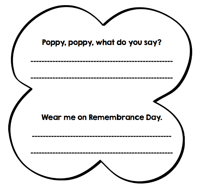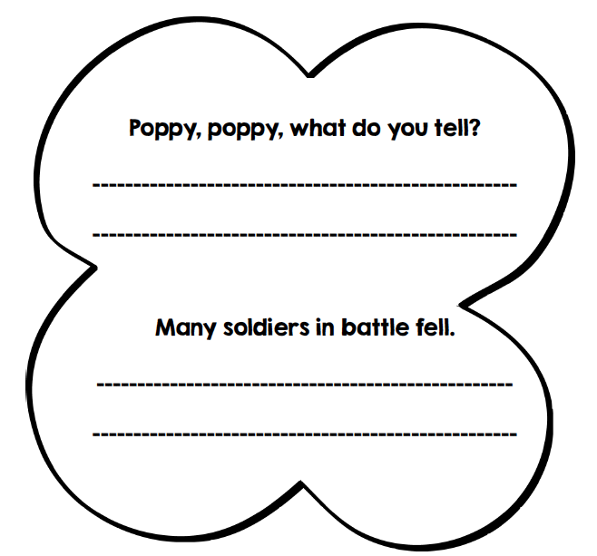 Another activity I do every year is a Poppy Booklet. Each pair of lines is printed on a poppy-shaped paper, with room underneath for the kids to copy the text. When their printing is finished I get them to colour and decorate the pages. After cutting out each page we then staple them together in a booklet.