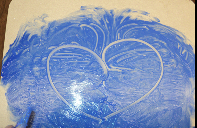 I couldn’t find any in the school, so I squirted a bit of blue and white tempera paint on a finger paint board, then mixed in a dab of dishwashing liquid. I thought it might add to the creamy texture AND help a bit with the clean-up.