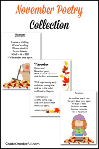 Inside: 3 free printable poems for November. Hello Friends and Happy November! I have the sweetest November poems for you today. The first poem I actually posted four years ago! But last night I added two more lovely poems to the collection that I’d love to share with you. I love teaching this first poem to my firsties, mostly because … Read more