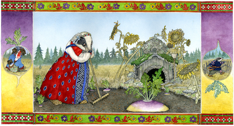 Badger Girl struggles to pull it up, dreaming of pancakes and pies. Badger Boy tries to help her. More animals join the line, each one bragging that he will pull it out. But they can’t budge the giant turnip.